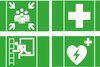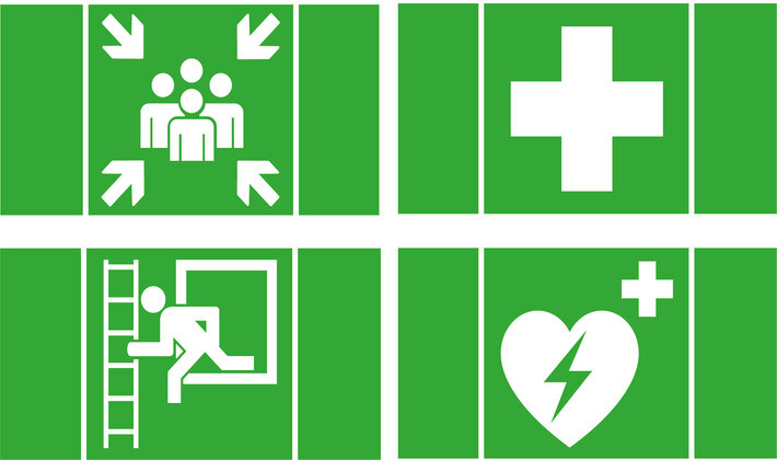 Das Set besteht aus je zwei Piktogrammen zur Kennzeichnung von: Sammeplatz, Erste-Hilfe-Stelle, Notausstieg, Defibrillator