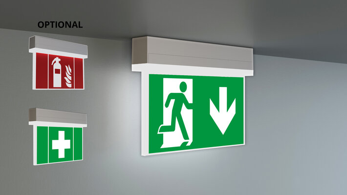 Automatische Überwachung der Sicherheitsleuchte mit SelfControl. Planungssicherheit ist durch werkzeuglosen, variablen Einsatz der Piktogramme vor Ort gegeben. Die Piktogramme entsprechend DIN ISO 7010 (Pfeil rechts, links, unten und oben) sind standardmäßig im Lieferumfang enthalten. Auf Anfrage kann die Beschriftung auch nach Kundenvorgabe erfolgen. Die Universalmontage beinhaltet Wand- und Deckenanbau, sowie die Möglichkeit zum Deckeneinbau in Verbindung mit dem erhältlichen Einbaurahmen.
