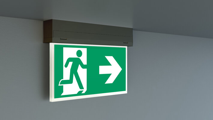 Kabelllose zentrale Steuerung und Überwachung für große Installationen von bis zu 50.000 Leuchten mit Wireless Professional. Planungssicherheit ist durch werkzeuglosen, variablen Einsatz der Piktogramme vor Ort gegeben. Die Piktogramme entsprechend DIN ISO 7010 (Pfeil rechts, links, unten und oben) sind standardmäßig im Lieferumfang enthalten. Auf Anfrage kann die Beschriftung auch nach Kundenvorgabe erfolgen. Die Universalmontage beinhaltet Wand- und Deckenanbau, sowie die Möglichkeit zum Deckeneinbau in Verbindung mit dem erhältlichen Einbaurahmen.