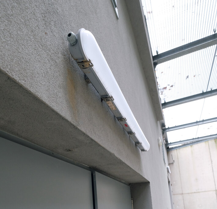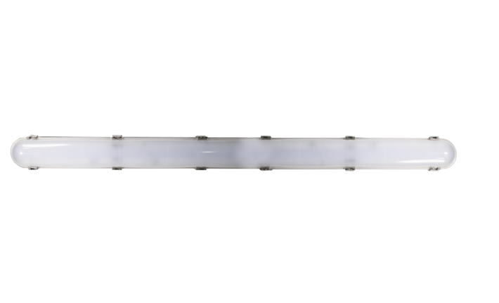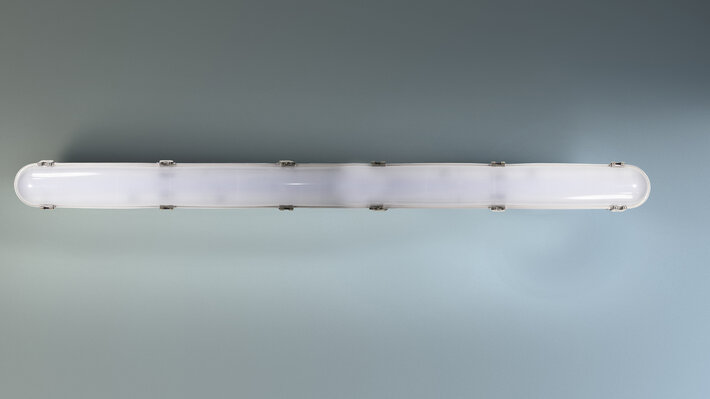 Die robuste LED-Wand- und Deckenleuchte aus glasfaserverstärktem Polyester für Feuchtraumanwendungen. Die externen Befestigungsbügel erleichtern die Montage.