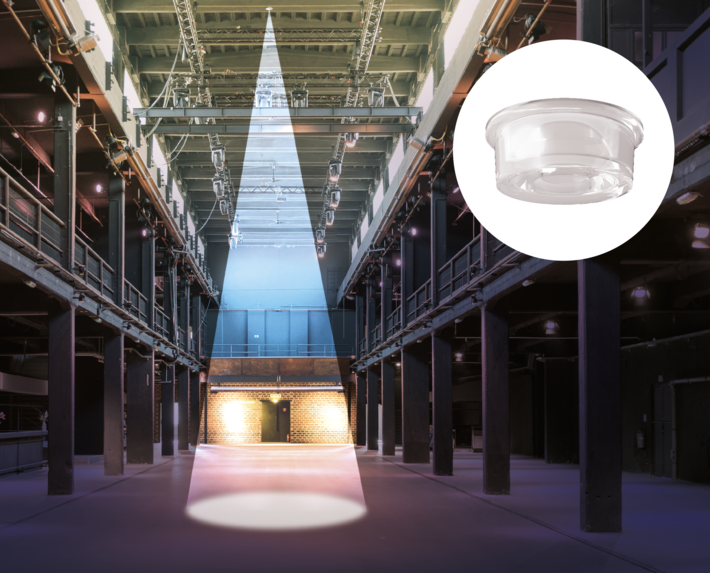 Die Spot-Linse sorgt für eine gleichmäßige Verteilung des Lichts in alle Richtungen. Geeignet für Deckenhöhen deutlich über 4 Meter wie beispielsweise in einer Produktionsstätte. Auch für offene Bereiche in Hotels (Überbrückungszeit 8 Stunden) einsetzbar.
