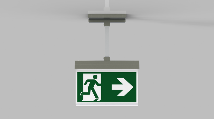 Automatic monitoring of safety luminaire with SelfControl. Planning certainty is provided by tool-free, variable use of the pictograms on site. A set of pictograms corresponding to DIN ISO 7010 (arrow to the right, left, up and down) is supplied as standard.