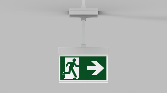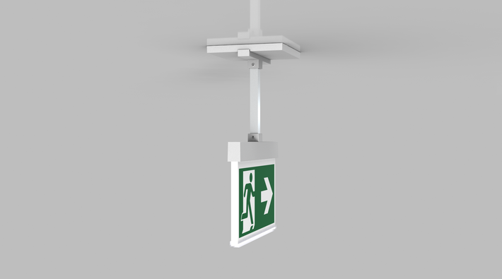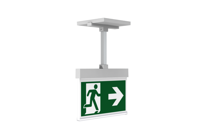 Automatic monitoring of safety luminaire with SelfControl. Planning certainty is provided by tool-free, variable use of the pictograms on site. A set of pictograms corresponding to DIN ISO 7010 (arrow to the right, left, up and down) is supplied as standard.