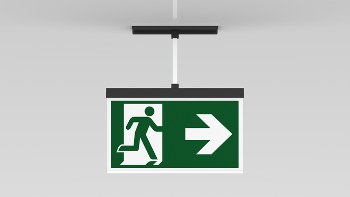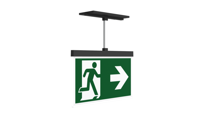 Modern zinc die-cast emergency exit sign luminaire with pendant for recessed mounting in the ceiling. Escape and emergency routes can be identified on either one or two sides.