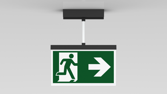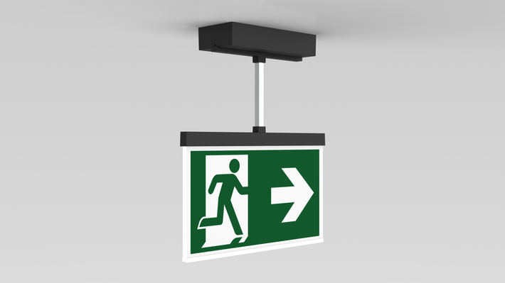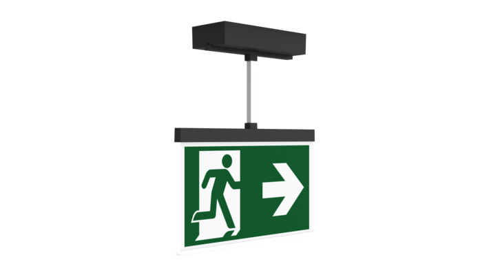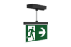 Modern zinc die-cast emergency exit sign luminaire with pendant for surface mounting on the ceiling. Escape and emergency routes can be identified on either one or two sides.