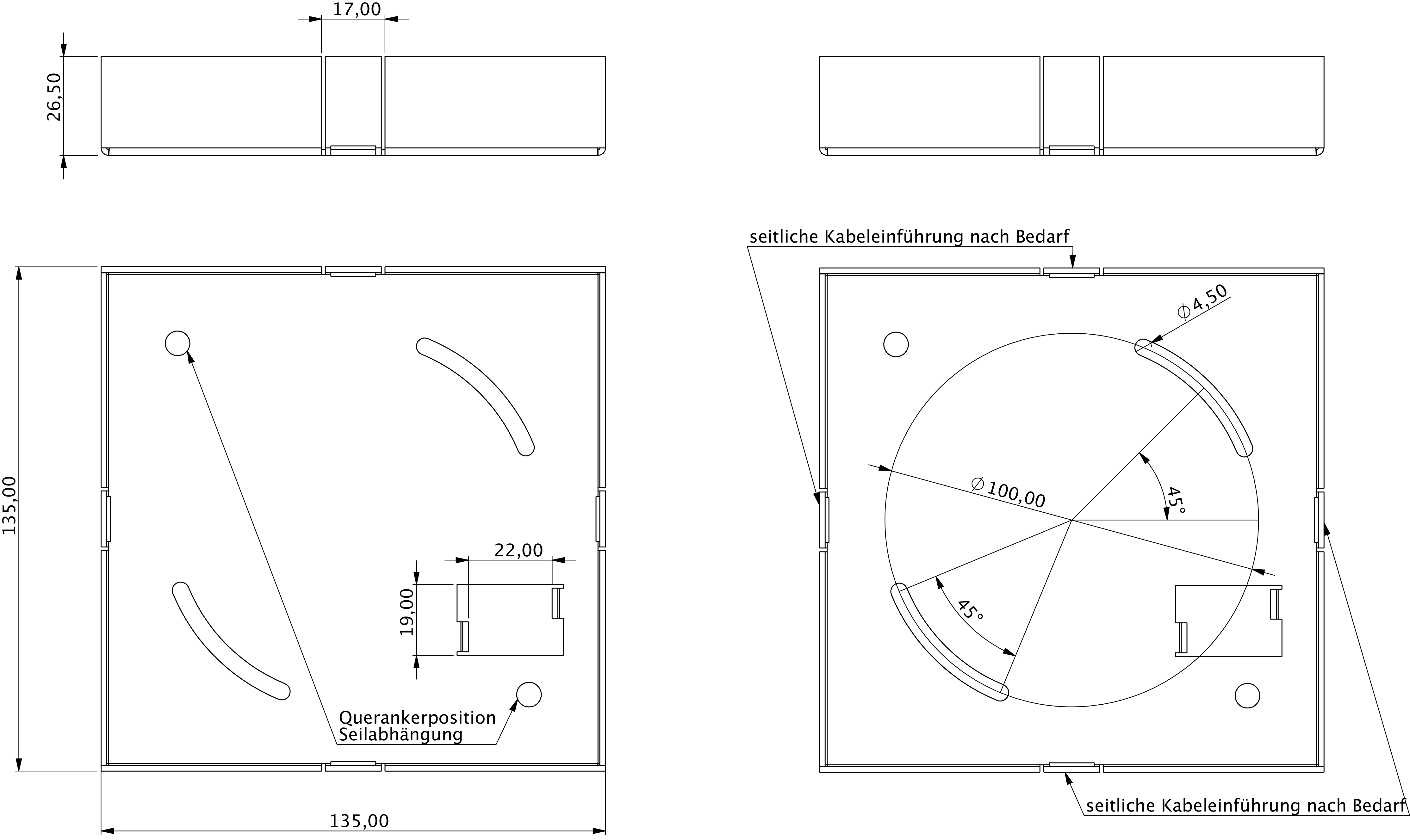 By simply inserting, the wire is secured to two points on the surface-mounted adapter with cross stays. The wire with a diameter of just 1.5 mm ensures an elegant and high-quality suspension. The load capacity is 15kg with a safety factor of 5:1 per wire. Simple handling means that the height can be adjusted with just one hand. Two adjustable attachment points with optimised leg length simplify alignment and ensure the perfect balance.