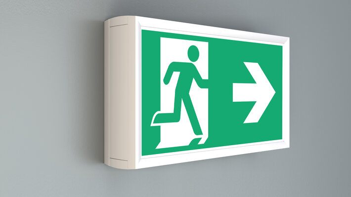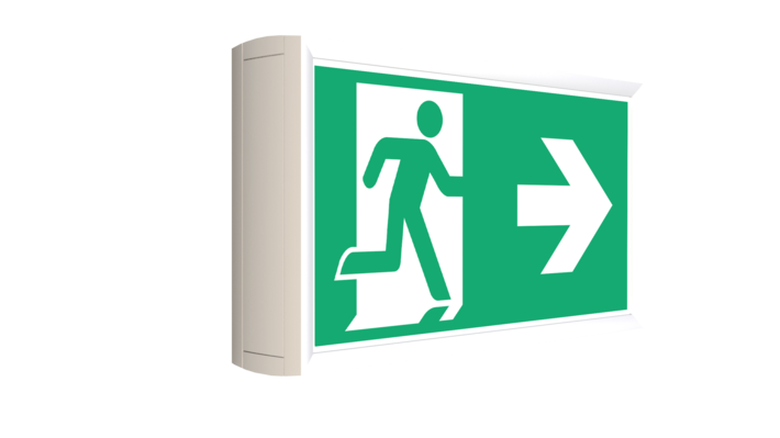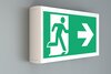 Automatic monitoring of safety luminaire with SelfControl. Planning certainty is provided by tool-free, variable use of the pictograms on site. A set of pictograms corresponding to DIN ISO 7010 (arrow to the right, left, up and down) is supplied as standard.