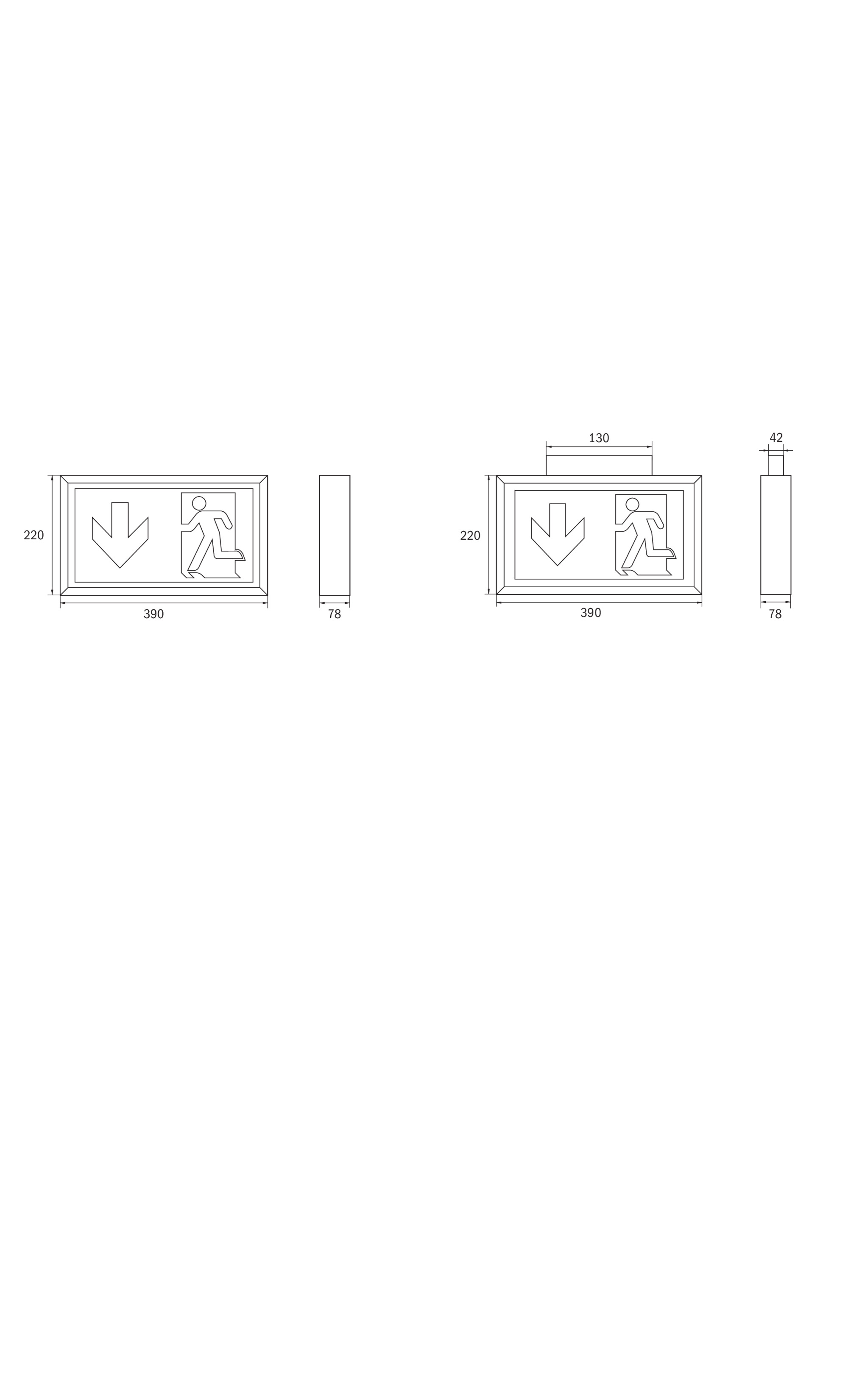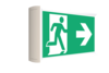 Box-shaped plastic emergency exit sign luminaire for universal mounting. Suited to inscription on one or two sides.