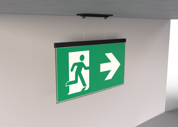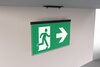 Luminaire moderne à pictogramme de secours en zinc moulé sous pression avec suspension par câble pour montage encastré au plafond. La signalisation des issues de secours et des voies d’évacuation s’effectue au choix sur une face ou sur les deux faces.