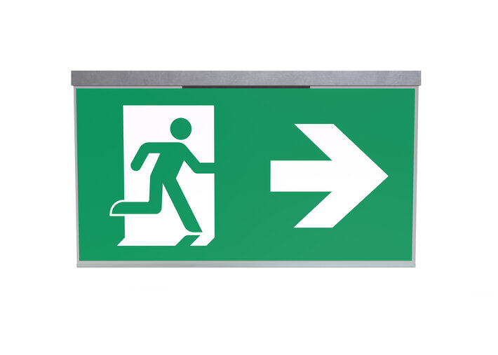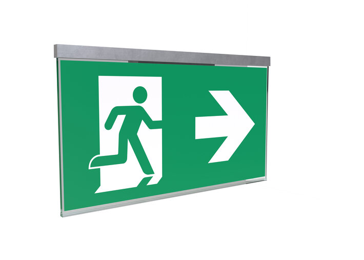 Luminaire moderne à pictogramme de secours en zinc moulé sous pression pour montage mural, pour la signalisation des issues de secours et des voies d’évacuation.
