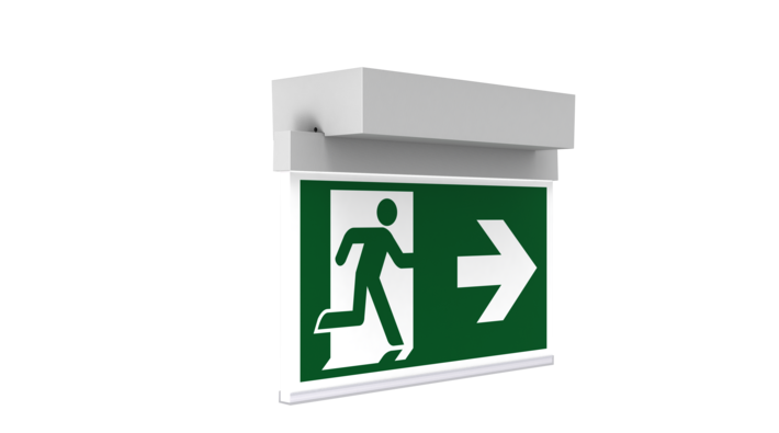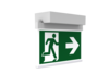 Luminaire moderne à pictogramme de secours en zinc moulé sous pression pour montage en saillie au plafond. La signalisation des issues de secours et des voies d’évacuation s’effectue au choix sur une face ou sur les deux faces.