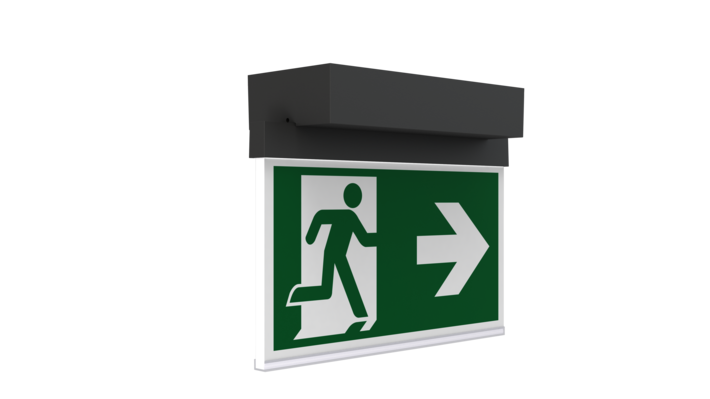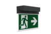 Luminaire moderne à pictogramme de secours en zinc moulé sous pression pour montage en saillie au plafond. La signalisation des issues de secours et des voies d’évacuation s’effectue au choix sur une face ou sur les deux faces.