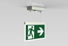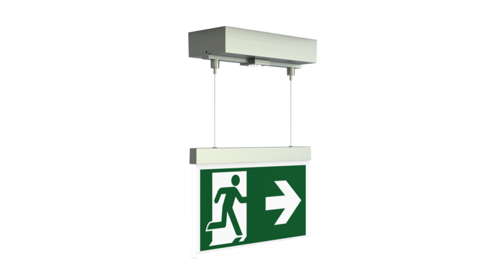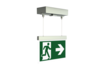 Luminaire moderne à pictogramme de secours/de sécurité en zinc moulé sous pression avec suspension par câble pour montage en saillie au plafond. La signalisation des issues de secours et des voies d’évacuation s’effectue au choix sur une face ou sur les deux faces. La technologie Duo assure, à l’aide d’une LED supplémentaire, la signalisation lumineuse des voies d’évacuation et des issues de secours en cas de panne de courant.