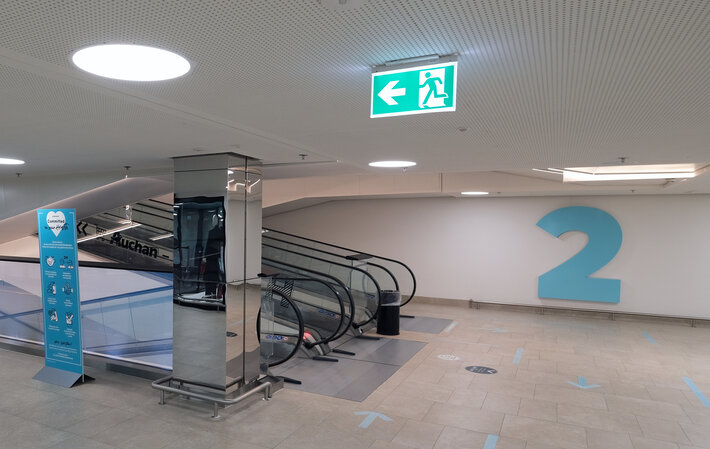 Commande et surveillance centralisées sans fil pour les grandes installations comptant jusqu'à 50 000 luminaires avec Wireless Professional. Impossible de se tromper lors de la planification grâce aux pictogrammes logiques imprimés. Les pictogrammes conformes à la norme DIN ISO 7010 (flèches à droite, à gauche et en bas) sont contenus dans la livraison standard. L’impression peut également être faite sur demande en fonction des prescriptions du client.
