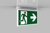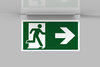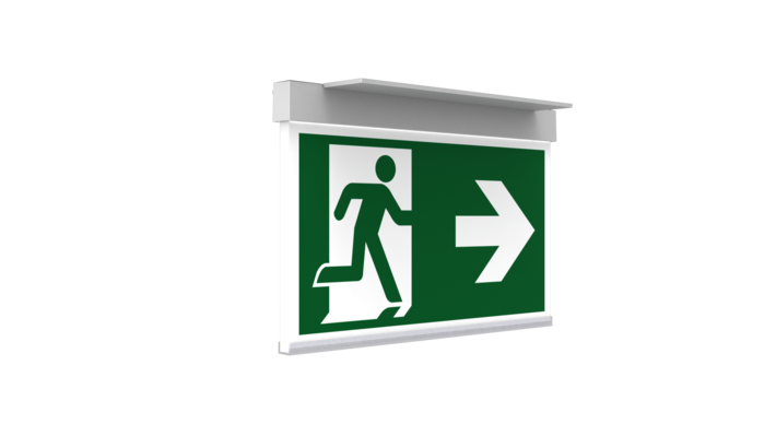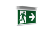 Luminaire moderne à pictogramme de secours en zinc moulé sous pression pour montage encastré au plafond. La signalisation des issues de secours et des voies d’évacuation s’effectue au choix sur une face ou sur les deux faces.