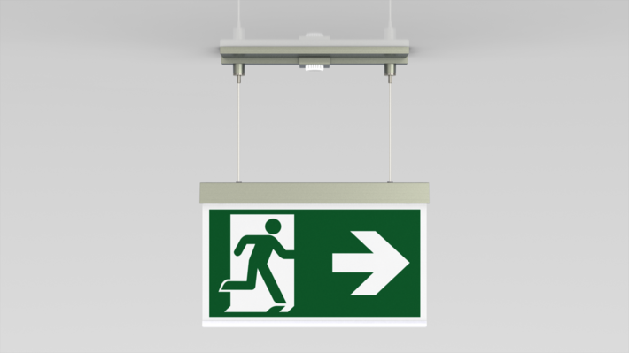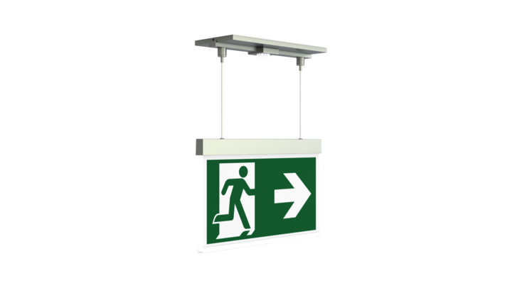 Luminaire moderne à pictogramme de secours/de sécurité en zinc moulé sous pression avec suspension par câble pour montage encastré au plafond. La signalisation des issues de secours et des voies d’évacuation s’effectue au choix sur une face ou sur les deux faces. La technologie Duo assure, à l’aide d’une LED supplémentaire, la signalisation lumineuse des voies d’évacuation et des issues de secours en cas de panne de courant.
