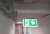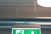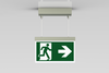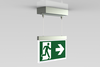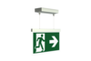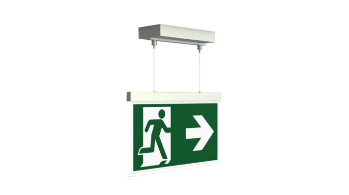 Luminaire moderne à pictogramme de secours en zinc moulé sous pression avec suspension par câble pour montage en saillie au plafond. La signalisation des issues de secours et des voies d’évacuation s’effectue au choix sur une face ou sur les deux faces.