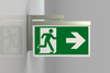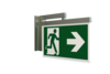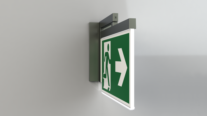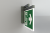 Luminaire moderne à pictogramme de secours en zinc moulé sous pression pour montage mural encastré. La signalisation des issues de secours et des voies d’évacuation s’effectue en angle droit par rapport au mur grâce au support mural, au choix sur une face ou sur les deux faces.