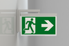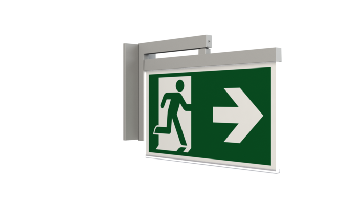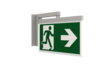 Luminaire moderne à pictogramme de secours en zinc moulé sous pression pour montage mural encastré. La signalisation des issues de secours et des voies d’évacuation s’effectue en angle droit par rapport au mur grâce au support mural, au choix sur une face ou sur les deux faces.