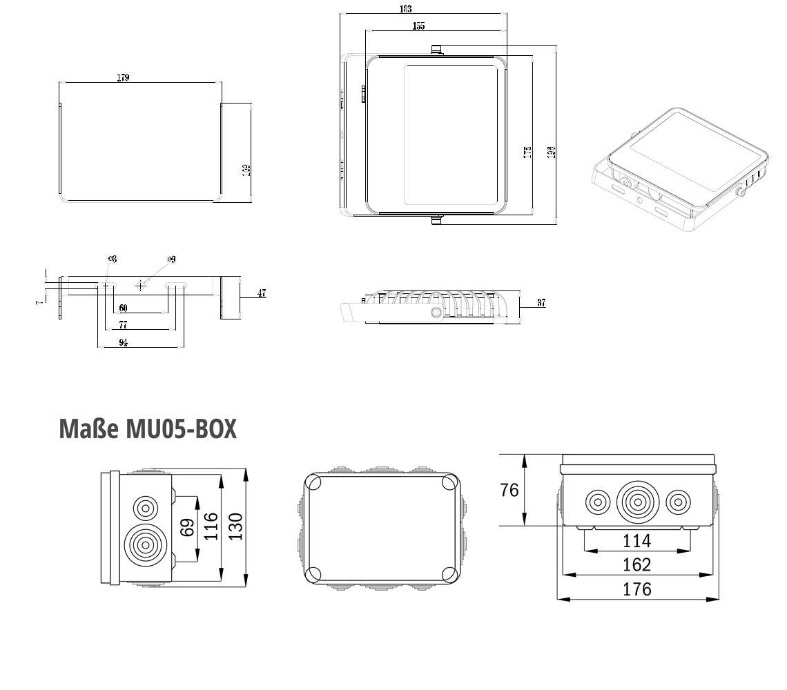 Projecteur pratique qui, grâce à son indice de protection élevé IP66 et à son boîtier en aluminium revêtu, convient à une utilisation en intérieur et en extérieur. Le large angle de rayonnement de la lampe de sécurité permet d'éclairer facilement de grandes surfaces. Le module de surveillance MU06 est installé dans le boîtier séparé fourni.