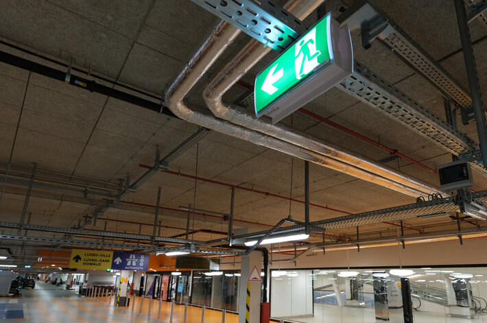 Commande et surveillance via un système d'alimentation électrique central. Impossible de se tromper lors de la planification grâce aux pictogrammes logiques imprimés. Les pictogrammes conformes à la norme DIN ISO 7010 (flèches à droite, à gauche et en bas) sont contenus dans la livraison standard. L’impression peut également être faite sur demande en fonction des prescriptions du client.
