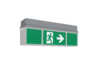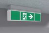 Luminaire à pictogramme de secours classique robuste en forme de poutre en plastique avec degré de protection élevé et pictogramme autocollant pour utilisation polyvalente.