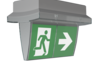 Luminaire à pictogramme de secours en plastique avec bandeau trapézoïdal.