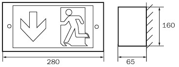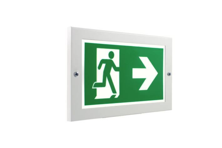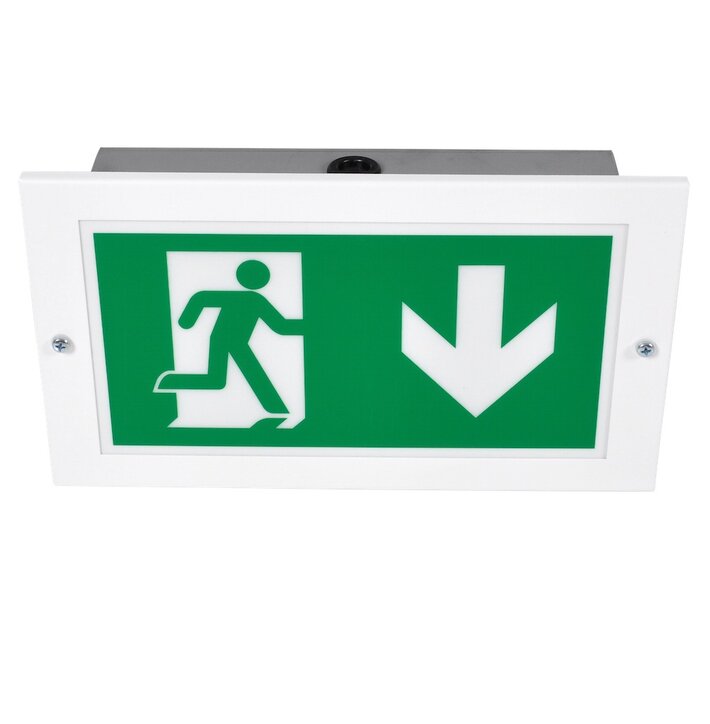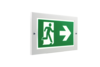 Luminaire à pictogramme de secours en métal encastré dans le mur.